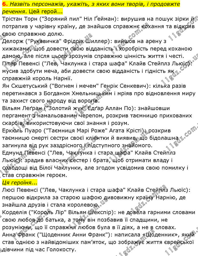 Назвіть персонажів, укажіть, з яких вони творів, і продовжте речення. Цей герой... Трістан Торн ("Зоряний пил" Ніл Ґейман): вирушив на пошук зірки й потрапив у чарівну країну, де знайшов справжнє кохання та відкрив свою справжню долю. Делорж ("Рукавичка" Фрідріх Шиллер): вийшов на арену з хижаками, щоб довести свою відданість і хоробрість перед коханою дамою, але після цього зрозумів справжню цінність життя і честі. Пітер Певенсі ("Лев, Чаклунка і стара шафа" Клайв Стейплз Льюїс): мусив здобути меча, аби довести свою відданість і гідність як справжній король Нарнії. Ян Скшетуський ("Вогнем і мечем" Генрік Сенкевич): кілька разів перетинався з Богданом Хмельницьким і мріяв про відновлення миру та захист свого народу від ворогів. Вільям Леґран ("Золотий жук" Едґар Аллан По): знайшовши пергамент з намальованим черепом, розкрив таємницю прихованих скарбів, використовуючи свої знання і розум. Еркюль Пуаро ("Таємниця Марі Роже" Агата Крісті): розкрив таємницю смерті сестри своєї клієнтки й виявив, що бідолашна загинула від рук заздрісного і підступного знайомого. Едмунд Певенсі ("Лев, Чаклунка і стара шафа" Клайв Стейплз Льюїс): зрадив власних сестер і брата, щоб отримати владу і солодощі від Білої Чаклунки, але згодом усвідомив свою помилку і став справжнім героєм. Ця героїня... Люсі Певенсі ("Лев, Чаклунка і стара шафа" Клайв Стейплз Льюїс): першою відкрила за старою шафою дивовижну країну Нарнію, де знайшла друзів і стала королевою. Корделія ("Король Лір" Вільям Шекспір): не довела гарними словами свою любов до батька, а тому він позбавив її спадщини, не розуміючи, що її справжня любов була в її діях, а не в словах. Анна Франк ("Щоденник Анни Франк"): написала «Щоденник», який став однією з найвідоміших пам’яток, що зображує життя єврейської дівчини під час Голокосту.