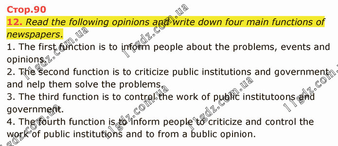 Read the following opinions and write down four main functions of newspapers. 1. The first function is to inform people about the problems, events and opinions. 2. The second function is to criticize public institutions and government and nelp them solve the problems. 3. The third function is to control the work of public institutoons and government. 4. The fourth function is to inform people to criticize and control the work of public institutions and to from a bublic opinion.