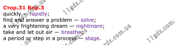 quickly — rapidly; find and answer a problem — solve; a very frightening dream — nightmare; take and let out air — breathe; a period or step in a process — stage.