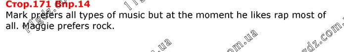 Впр.14 Mark prefers all types of music but at the moment he likes rap most of all. Maggie prefers rock.