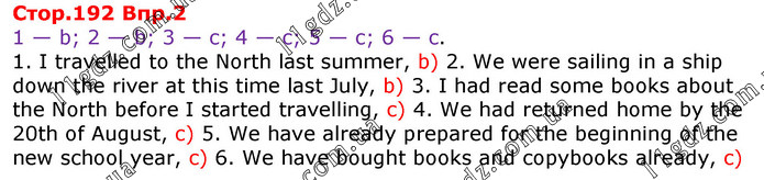 1 — b; 2 — b; 3 — c; 4 — c; 5 — c; 6 — c. 1. I travelled to the North last summer, b) 2. We were sailing in a ship down the river at this time last July, b) 3. I had read some books about the North before I started travelling, c) 4. We had returned home by the 20th of August, c) 5. We have already prepared for the beginning of the new school year, c) 6. We have bought books and copybooks already, c)