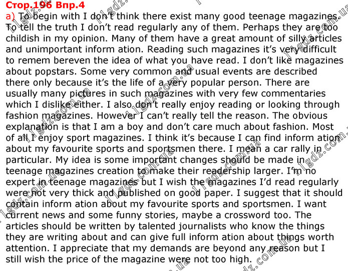 а) To begin with I don’t think there exist many good teenage magazines. To tell the truth I don’t read regularly any of them. Perhaps they are too childish in my opinion. Many of them have a great amount of silly articles and unimportant inform ation. Reading such magazines it’s very difficult to remem bereven the idea of what you have read. I don’t like magazines about popstars. Some very common and usual events are described there only because it’s the life of a very popular person. There are usually many pictures in such magazines with very few commentaries which I dislike either. I also don’t really enjoy reading or looking through fashion magazines. However I can’t really tell the reason. The obvious explanation is that I am a boy and don’t care much about fashion. Most of all I enjoy sport magazines. I think it’s because I can find inform ation about my favourite sports and sportsmen there. I mean a car rally in particular. My idea is some important changes should be made in teenage magazines creation to make their readership larger. I’m no expert in teenage magazines but I wish the magazines I’d read regularly were not very thick and published on good paper. I suggest that it should contain inform ation about my favourite sports and sportsmen. I want current news and some funny stories, maybe a crossword too. The articles should be written by talented journalists who know the things they are writing about and can give full inform ation about things worth attention. I appreciate that my demands are beyond any reason but I still wish the price of the magazine were not too high.