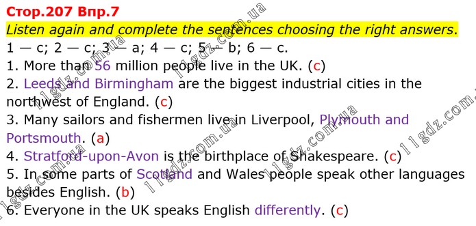 Listen again and complete the sentences choosing the right answers. 1 — c; 2 — с; 3 — a; 4 — c; 5 — b; 6 — с. 1. More than 56 million people live in the UK. (c) 2. Leeds and Birmingham are the biggest industrial cities in the northwest of England. (с) 3. Many sailors and fishermen live in Liverpool, Plymouth and Portsmouth. (a) 4. Stratford-upon-Avon is the birthplace of Shakespeare. (c) 5. In some parts of Scotland and Wales people speak other languages besides English. (b) 6. Everyone in the UK speaks English differently. (с)