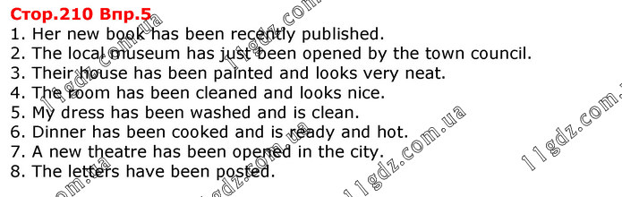 1. Her new book has been recently published. 2. The local museum has just been opened by the town council. 3. Their house has been painted and looks very neat. 4. The room has been cleaned and looks nice. 5. My dress has been washed and is clean. 6. Dinner has been cooked and is ready and hot. 7. A new theatre has been opened in the city. 8. The letters have been posted.