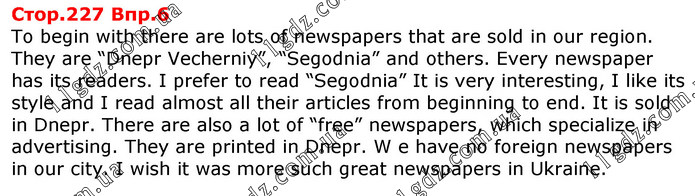 To begin with there are lots of newspapers that are sold in our region. They are “Dnepr Vecherniy”, “Segodnia” and others. Every newspaper has its readers. I prefer to read “Segodnia” It is very interesting, I like its style and I read almost all their articles from beginning to end. It is sold in Dnepr. There are also a lot of “free” newspapers, which specialize in advertising. They are printed in Dnepr. W e have no foreign newspapers in our city. I wish it was more such great newspapers in Ukraine.