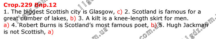 1. The biggest Scottish city is Glasgow, c) 2. Scotland is famous for a great number of lakes, b) 3. A kilt is a knee-length skirt for men. a) 4. Robert Burns is Scotland’s most famous poet, b) 5. Hugh Jackman is not Scottish, a)