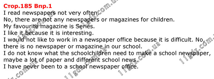 I read newspapers not very often. No, there are not any newspapers or magazines for children. My favourite magazine is Series. I like it because it is interesting. I would not like to work in a newspaper office because it is difficult. No, there is no newspaper or magazine in our school. I do not know what the schoolchildren need to make a school newspaper, maybe a lot of paper and different school news. I have never been to a school newspaper office.