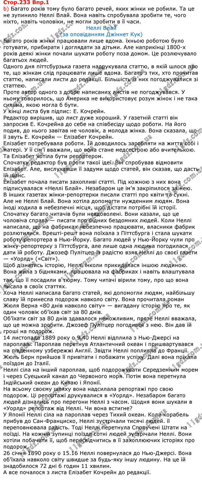 b) Багато років тому було багато речей, яких жінки не робили. Та це не зупинило Неллі Влай. Вона навіть спробувала зробити те, чого ніхто, навіть чоловіки, не могли зробити в її часи. Неллі Блай (за оповіданням Джіннет Кук) Багато років жінки працювали лише вдома. їхньою роботою було готувати, прибирати і доглядати за дітьми. Але наприкінці 1800-х років деякі жінки почали шукати роботу поза домом. Це розлючувало багатьох людей. Одного дня піттсбурзька газета надрукувала статтю, в якій шлося про те, що жінкам слід працювати лише вдома. Багато з тих, хто прочитав статтю, написали листи до редакції. Більшість із них погоджувалися зі статтею. Проте автор одного з добре написаних листів не погоджувався. У ньому говорилось, що Америка не використовує розум жінок і не така сильна, якою могла б бути. У кінці листа був підпис: Е. Кочрейн. Редактор вирішив, що лист дуже хороший. У газетній статті він запросив Е. Кочрейна до себе на співбесіду щодо роботи. На його подив, до нього завітав не чоловік, а молода жінка. Вона сказала, що її звуть Е. Кочрейн — Елізабет Кочрейн. Елізабет потребувала роботи. Їй доводилось заробляти на життя собі і матері. У її сім’ї вважали, що вона стане медсестрою або вчителькою. Та Елізабет хотіла бути репортером. Спочатку редактор був проти такої ідеї. Він спробував відмовити Елізабет. Але, вислухавши її задуми щодо статей, він сказав, що дасть їй шанс. Елізабет почала писати захопливі статті. Під кожною з них вона підписувалася «Неллі Блай». Незабаром це ім’я закріпилося за нею. В інших газетах жінки-репортерки писали статті про квіти та сукні. Але не Неллі Блай. Вона хотіла допомогти нужденним людям. Вона іноді ходила в небезпечні місця, щоб дістати потрібні їй історії. Спочатку багато читачів були невдоволені. Вони казали, що це чоловіча справа — писати про бідних бездомних людей. Коли Неллі написала, що на фабриках небезпечно працювати, власники фабрик розлютилися. Врешті-решт вона поїхала з Піттсбурга і стала шукати роботу репортера в Нью-Йорку. Багато людей у Нью-Йорку чули про жінку-репортерку з Піттсбурга, але лише одна людина погодилася дати їй роботу. Джозеф Пулітцер із радістю взяв Неллі до своєї газети — «Уорлд» («Світ»). Щоб дізнатись історію, Неллі інколи прикидалася іншою людиною. Вона жила з бідняками, працювала на фабриках і навіть влаштувала так, що її посадили в тюрму. Тому читачі вірили тому, про що вона писала в своїх статтях. Хоча Неллі написала багато статей, які допомогли людям, найбільшу славу їй принесла подорож навколо світу. Вона прочитала роман Жюля Верна «80 днів навколо світу» — вигадану історію про те, як один чоловік об’їхав світ за 80 днів. Об’їхати світ за 80 днів здавалося неможливим, проте Неллі вважала, що це можна зробити. Джозеф Пулітцер погодився з нею. Він дав їй гроші на подорож. 14 листопада 1889 року о 9.40 Неллі відплила з Нью-Джерсі на пароплаві. Пароплав перетнув Атлантичний океан і пришвартувався на південному узбережжі Англії. Звідти Неллі попливла до Франції. Жюль Берн прийшов її привітати і побажати успіху. Далі вона поїхала поїздом до Італії. Неллі сіла на інший пароплав, щоб подорожувати Середземним морем і через Суецький канал до Червоного моря. Потім вона перетнула Індійський океан до Китаю і Японії. На всьому своєму шляху вона надсилала репортажі про свою подорож. Ці репортажі друк