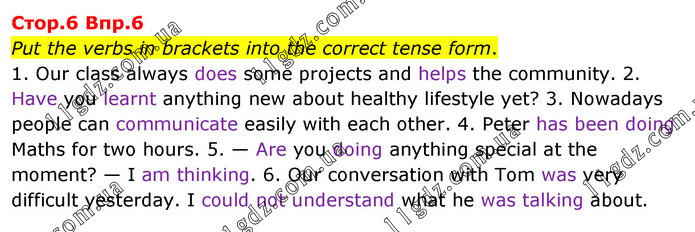 Put the verbs in brackets into the correct tense form. 1. Our class always does some projects and helps the community. 2. Have you learnt anything new about healthy lifestyle yet? 3. Nowadays people can communicate easily with each other. 4. Peter has been doing Maths for two hours. 5. — Are you doing anything special at the moment? — I am thinking. 6. Our conversation with Tom was very difficult yesterday. I could not understand what he was talking about.