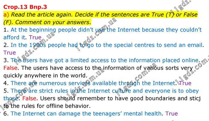 a) Read the article again. Decide if the sentences are True (T) or False (F). Comment on your answers. 1. At the beginning people didn’t use the Internet because they couldn’t afford it. True 2. In the 1990s people had to go to the special centres to send an email. True 3. The users have got a limited access to the information placed online. False. The users have access to the information of various sorts very quickly anywhere in the world. 4. There are numerous services available through the Internet. True 5. There are strict rules in the Internet culture and everyone is to obey those. False. Users should remember to have good boundaries and sticj to the rules for offline behavior. 6. The Internet can damage the teenagers’ mental health. True