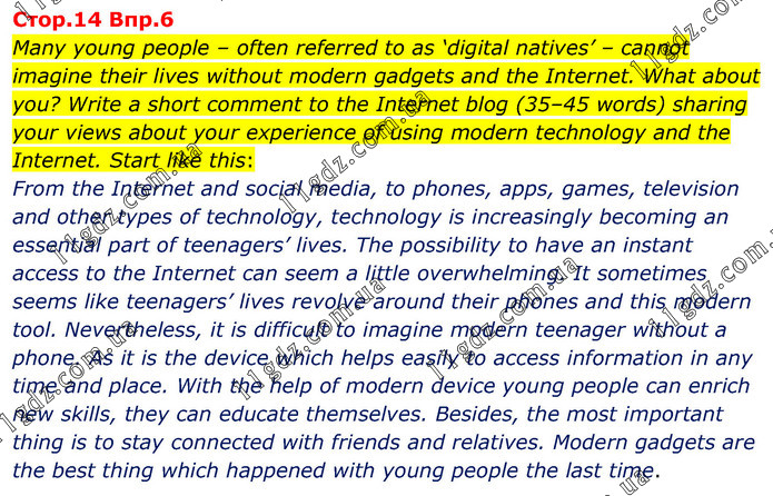 Many young people – often referred to as ‘digital natives’ – cannot imagine their lives without modern gadgets and the Internet. What about you? Write a short comment to the Internet blog (35–45 words) sharing your views about your experience of using modern technology and the Internet. Start like this: From the Internet and social media, to phones, apps, games, television and other types of technology, technology is increasingly becoming an essential part of teenagers’ lives. The possibility to have an instant access to the Internet can seem a little overwhelming. It sometimes seems like teenagers’ lives revolve around their phones and this modern tool. Nevertheless, it is difficult to imagine modern teenager without a phone. As it is the device which helps easily to access information in any time and place. With the help of modern device young people can enrich new skills, they can educate themselves. Besides, the most important thing is to stay connected with friends and relatives. Modern gadgets are the best thing which happened with young people the last time.