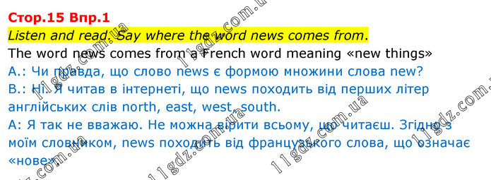 Listen and read. Say where the word news comes from. The word news comes from a French word meaning «new things» A.: Чи правда, що слово news є формою множини слова new? B.: Ні. Я читав в інтернеті, що news походить від перших літер англійських слів north, east, west, south. А: Я так не вважаю. Не можна вірити всьому, що читаєш. Згідно з моїм словником, news походить від французького слова, що означає «нове».