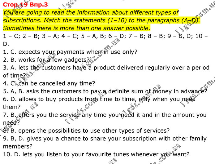 You are going to read the information about different types of subscriptions. Match the statements (1–10) to the paragraphs (A–D). Sometimes there is more than one answer possible. 1 – C; 2 – B; 3 – A; 4 – C; 5 – A, B; 6 – D; 7 – B; 8 – B; 9 – B, D; 10 – D. 1. C. expects your payments when in use only? 2. B. works for a few gadgets? 3. A. lets the customers have a product delivered regularly over a period of time? 4. C. can be cancelled any time? 5. A, B. asks the customers to pay a definite sum of money in advance? 6. D. allows to buy products from time to time, only when you need them? 7. B. offers you the service any time you need it and in the amount you need? 8. B. opens the possibilities to use other types of services? 9. B, D. gives you a chance to share your subscription with other family members? 10. D. lets you listen to your favourite tunes whenever you want?