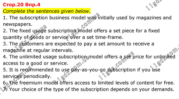 Complete the sentences given below. 1. The subscription business model was initially used by magazines and newspapers. 2. The fixed usage subscription model offers a set piece for a fixed quantity of goods or service over a set time-frame. 3. The customers are expected to pay a set amount to receive a magazine at regular intervals. 4. The unlimited usage subscription model offers a set price for unlimited access to a good or service. 5. It is recommended to use pay-as-you-go subscription if you use services periodically. 6. The freemium model offers access to limited levels of content for free. 7. Your choice of the type of the subscription depends on your demands.