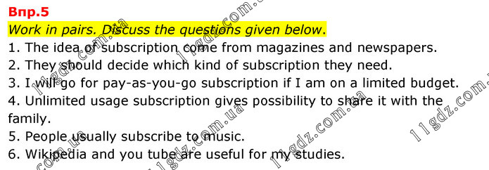 Work in pairs. Discuss the questions given below. 1. The idea of subscription come from magazines and newspapers. 2. They should decide which kind of subscription they need. 3. I will go for pay-as-you-go subscription if I am on a limited budget. 4. Unlimited usage subscription gives possibility to share it with the family. 5. People usually subscribe to music. 6. Wikipedia and you tube are useful for my studies.