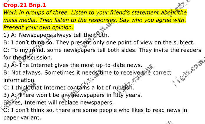 Work in groups of three. Listen to your friend’s statement about the mass media. Then listen to the responses. Say who you agree with. Present your own opinion. 1) A: Newspapers always tell the truth. B: I don’t think so. They present only one point of view on the subject. C: To my mind, some newspapers tell both sides. They invite the readers for the discussion. 2) A: The Internet gives the most up-to-date news. B: Not always. Sometimes it needs time to receive the correct information C: I think that Internet contains a lot of rubbish. 3) A: There won’t be any newspapers in fifty years. B: Yes, Internet will replace newspapers. C: I don’t think so, there are some people who likes to read news in paper variant.