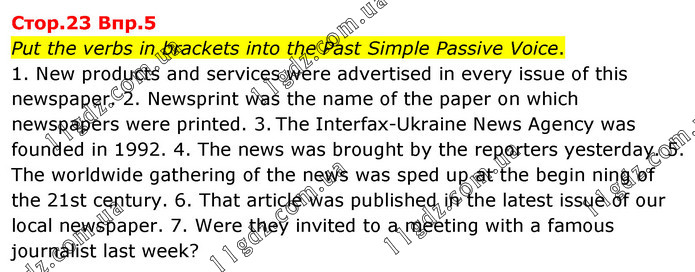 Put the verbs in brackets into the Past Simple Passive Voice. 1. New products and services were advertised in every issue of this newspaper. 2. Newsprint was the name of the paper on which newspapers were printed. 3. The Interfax-Ukraine News Agency was founded in 1992. 4. The news was brought by the reporters yesterday. 5. The worldwide gathering of the news was sped up at the begin ning of the 21st century. 6. That article was published in the latest issue of our local newspaper. 7. Were they invited to a meeting with a famous journalist last week?