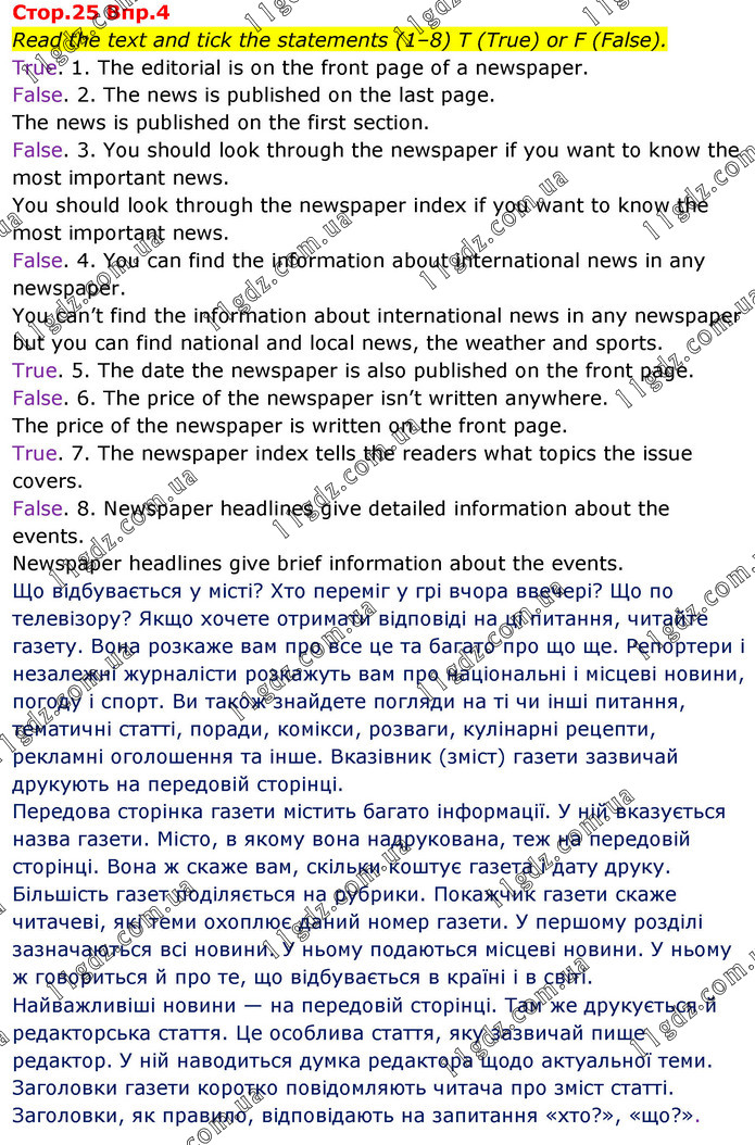 Read the text and tick the statements (1–8) T (True) or F (False). True. 1. The editorial is on the front page of a newspaper. False. 2. The news is published on the last page. The news is published on the first section. False. 3. You should look through the newspaper if you want to know the most important news. You should look through the newspaper index if you want to know the most important news. False. 4. You can find the information about international news in any newspaper. You can’t find the information about international news in any newspaper but you can find national and local news, the weather and sports. True. 5. The date the newspaper is also published on the front page. False. 6. The price of the newspaper isn’t written anywhere. The price of the newspaper is written on the front page. True. 7. The newspaper index tells the readers what topics the issue covers. False. 8. Newspaper headlines give detailed information about the events. Newspaper headlines give brief information about the events. Що відбувається у місті? Хто переміг у грі вчора ввечері? Що по телевізору? Якщо хочете отримати відповіді на ці питання, читайте газету. Вона розкаже вам про все це та багато про що ще. Репортери і незалежні журналісти розкажуть вам про національні і місцеві новини, погоду і спорт. Ви також знайдете погляди на ті чи інші питання, тематичні статті, поради, комікси, розваги, кулінарні рецепти, рекламні оголошення та інше. Вказівник (зміст) газети зазвичай друкують на передовій сторінці. Передова сторінка газети містить багато інформації. У ній вказується назва газети. Місто, в якому вона надрукована, теж на передовій сторінці. Вона ж скаже вам, скільки коштує газета і дату друку. Більшість газет поділяється на рубрики. Покажчик газети скаже читачеві, які теми охоплює даний номер газети. У першому розділі зазначаються всі новини. У ньому подаються місцеві новини. У ньому ж говориться й про те, що відбувається в країні і в світі. Найважливіші новини — на передовій сторінці. Там же друкується й редакторська стаття. Це особлива стаття, яку зазвичай пише редактор. У ній наводиться думка редактора щодо актуальної теми. Заголовки газети коротко повідомляють читача про зміст статті. Заголовки, як правило, відповідають на запитання «хто?», «що?».