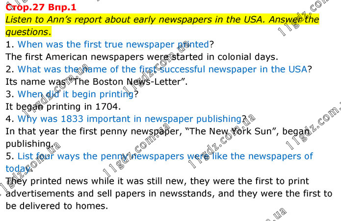 Listen to Ann’s report about early newspapers in the USA. Answer the questions. 1. When was the first true newspaper printed? The first American newspapers were started in colonial days. 2. What was the name of the first successful newspaper in the USA? Its name was “The Boston News-Letter”. 3. When did it begin printing? It began printing in 1704. 4. Why was 1833 important in newspaper publishing? In that year the first penny newspaper, “The New York Sun”, began publishing. 5. List four ways the penny newspapers were like the newspapers of today. They printed news while it was still new, they were the first to print advertisements and sell papers in newsstands, and they were the first to be delivered to homes.