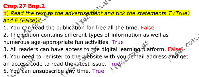 b) Read the text to the advertisement and tick the statements T (True) and F (False). 1. You can read the publication for free all the time. False 2. The edition contains different types of information as well as numerous age-appropriate fun activities. True 3. All readers can have access to the digital learning platform. False 4. You need to register to the website with your email address and get an access code to read the latest issue. True 5. You can unsubscribe any time. True