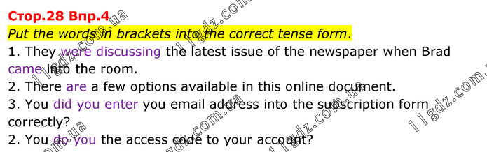 Put the words in brackets into the correct tense form. 1. They were discussing the latest issue of the newspaper when Brad came into the room. 2. There are a few options available in this online document. 3. You did you enter you email address into the subscription form correctly? 2. You do you the access code to your account?
