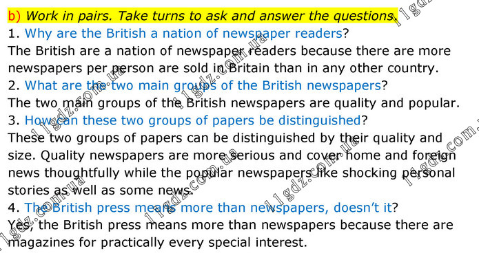 b) Work in pairs. Take turns to ask and answer the questions. 1. Why are the British a nation of newspaper readers? The British are a nation of newspaper readers because there are more newspapers per person are sold in Britain than in any other country. 2. What are the two main groups of the British newspapers? The two main groups of the British newspapers are quality and popular. 3. How can these two groups of papers be distinguished? These two groups of papers can be distinguished by their quality and size. Quality newspapers are more serious and cover home and foreign news thoughtfully while the popular newspapers like shocking personal stories as well as some news. 4. The British press means more than newspapers, doesn’t it? Yes, the British press means more than newspapers because there are magazines for practically every special interest.