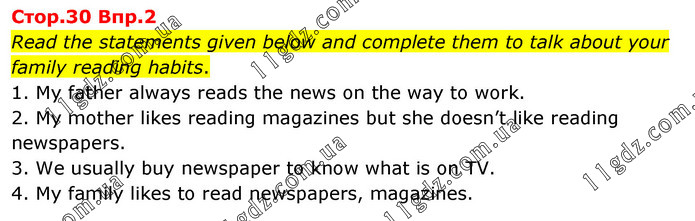Read the statements given below and complete them to talk about your family reading habits. 1. My father always reads the news on the way to work. 2. My mother likes reading magazines but she doesn’t like reading newspapers. 3. We usually buy newspaper to know what is on TV. 4. My family likes to read newspapers, magazines.