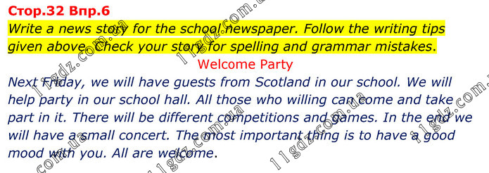 Write a news story for the school newspaper. Follow the writing tips given above. Check your story for spelling and grammar mistakes. Welcome Party Next Friday, we will have guests from Scotland in our school. We will help party in our school hall. All those who willing can come and take part in it. There will be different competitions and games. In the end we will have a small concert. The most important thing is to have a good mood with you. All are welcome.