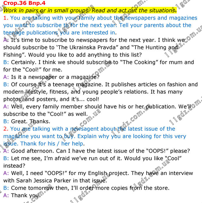 Work in pairs or in small groups. Read and act out the situations. 1. You are talking with your family about the newspapers and magazines you want to subscribe to for the next year. Tell your parents about the teenage publications you are interested in. A: It’s time to subscribe to newspapers for the next year. I think we should subscribe to ‘The Ukrainska Pravda” and “The Hunting and Fishing”. Would you like to add anything to this list? B: Certainly. I think we should subscribe to “The Cooking” for mum and for the “Cool!” for me. A: Is it a newspaper or a magazine? B: Of course it’s a teenage magazine. It publishes articles on fashion and modern lifestyle, fitness, and young people’s relations. It has many photos, and posters, and it’s... cool! A: Well, every family member should have his or her publication. We’ll subscribe to the “Cool!” as well. B: Great. Thanks. 2. You are talking with a newsagent about the latest issue of the magazine you want to buy. Explain why you are looking for this very issue. Thank for his / her help. A: Good afternoon. Can I have the latest issue of the “OOPS!” please? B: Let me see, I’m afraid we’ve run out of it. Would you like “Cool” instead? A: Well, I need “OOPS!” for my English project. They have an interview with Sarah Jessica Parker in that issue. B: Come tomorrow then, I’ll order more copies from the store. A: Thank you.