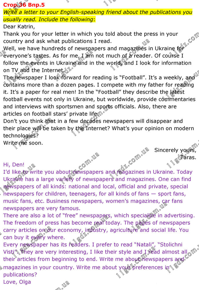 Write a letter to your English-speaking friend about the publications you usually read. Include the following: Dear Katrin, Thank you for your letter in which you told about the press in your country and ask what publications I read. Well, we have hundreds of newspapers and magazines in Ukraine for everyone’s tastes. As for me, I am not much of a reader. Of course I follow the events in Ukraine and in the world, and I look for information on TV and the Internet. The newspaper I look forward for reading is “Football”. It’s a weekly, and contains more than a dozen pages. I compete with my father for reading it. It’s a paper for real men! In the “Football” they describe the latest football events not only in Ukraine, but worldwide, provide commentaries and interviews with sportsmen and sports officials. Also, there are articles on football stars’ private life. Don’t you think that in a few decades newspapers will disappear and their place will be taken by the Internet? What’s your opinion on modern technologies? Write me soon. Sincerely yours, Taras. Hi, Den! I’d like to write you about newspapers and magazines in Ukraine. Today Ukraine has a large variety of newspapers and magazines. One can find newspapers of all kinds: national and local, official and private, special newspapers for children, teenagers, for all kinds of fans — sport fans, music fans, etc. Business newspapers, women’s magazines, car fans newspapers are very famous. There are also a lot of “free” newspapers, which specialize in advertising. The freedom of press has become real today. The pages of newspapers carry articles on our economy, industry, agriculture and social life. You can buy it every where. Every newspaper has its readers. I prefer to read “Natali”, “Stolichni Visti”. They are very interesting, I like their style and I read almost all their articles from beginning to end. Write me about newspapers and magazines in your country. Write me about your preferences in publications? Love, Olga