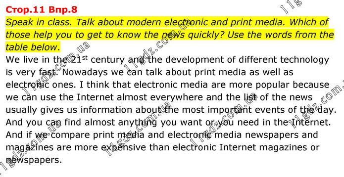 Speak in class. Talk about modern electronic and print media. Whiсh of those help you to get to know the news quickly? Use the words from the table below. We live in the 21st century and the development of different technology is very fast. Nowadays we can talk about print media as well as electronic ones. I think that electronic media are more popular because we can use the Internet almost everywhere and the list of the news usually gives us information about the most important events of the day. And you can find almost anything you want or you need in the Internet. And if we compare print media and electronic media newspapers and magazines are more expensive than electronic Internet magazines or newspapers.