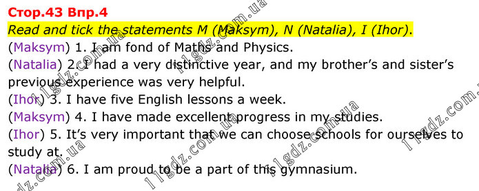 Read and tick the statements M (Maksym), N (Natalia), I (Ihor). (Maksym) 1. I am fond of Maths and Physics. (Natalia) 2. I had a very distinctive year, and my brother’s and sister’s previous experience was very helpful. (Ihor) 3. I have five English lessons a week. (Maksym) 4. I have made excellent progress in my studies. (Ihor) 5. It’s very important that we can choose schools for ourselves to study at. (Natalia) 6. I am proud to be a part of this gymnasium.