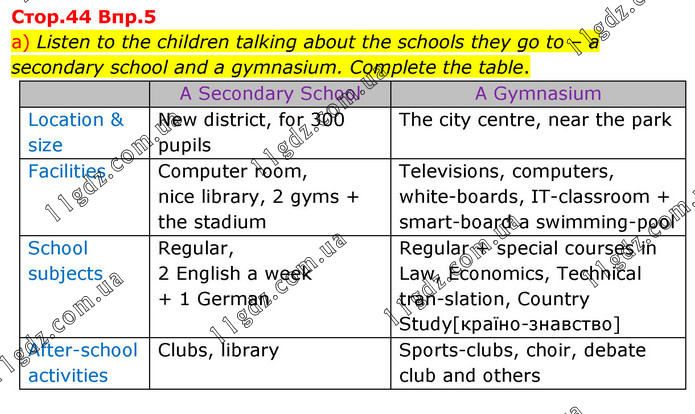 а) Listen to the children talking about the schools they go to – a secondary school and a gymnasium. Complete the table. A Secondary School A Gymnasium Location & size New district, for 300 pupils The city centre, near the park Facilities Computer room, nice library, 2 gyms + the stadium Televisions, computers, white-boards, IT-classroom + smart-board a swimming-pool School subjects Regular, 2 English a week + 1 German Regular + special courses in Law, Economics, Technical tran-slation, Country Study[країно-знавство] After-school activities Clubs, library Sports-clubs, choir, debate club and others
