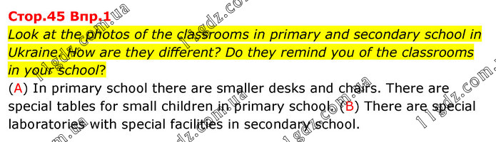 Look at the photos of the classrooms in primary and secondary school in Ukraine. How are they different? Do they remind you of the classrooms in your school? (A) In primary school there are smaller desks and chairs. There are special tables for small children in primary school. (B) There are special laboratories with special facilities in secondary school.