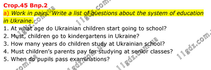 a) Work in pairs. Write a list of questions about the system of education in Ukraine. 1. At what age do Ukrainian children start going to school? 2. Must, children go to kindergartens in Ukraine? 3. How many years do children study at Ukrainian school? 4. Must children’s parents pay for studying at senior classes? 5. When do pupils pass examinations?