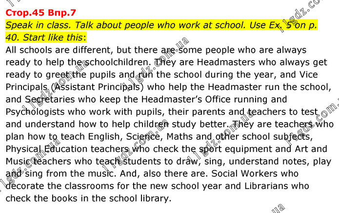 Speak in class. Talk about people who work at school. Use Ex. 5 on p. 40. Start like this: All schools are different, but there are some people who are always ready to help the schoolchildren. They are Headmasters who always get ready to greet the pupils and run the school during the year, and Vice Principals (Assistant Principals) who help the Headmaster run the school, and Secretaries who keep the Headmaster’s Office running and Psychologists who work with pupils, their parents and teachers to test and understand how to help children study better. They are teachers who plan how to teach English, Science, Maths and other school subjects, Physical Education teachers who check the sport equipment and Art and Music teachers who teach students to draw, sing, understand notes, play and sing from the music. And, also there are. Social Workers who decorate the classrooms for the new school year and Librarians who check the books in the school library.