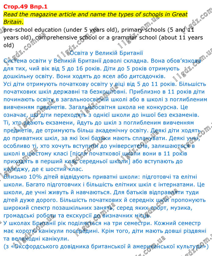 Read the magazine article and name the types of schools in Great Britain. pre-school education (under 5 years old), primary schools (5 and 11 years old), comprehensive school or a grammar school (about 11 years old) Освіта у Великій Британії Система освіти у Великій Британії доволі складна. Вона обов’язкова для тих, чий вік від 5 до 16 років. Діти до 5 років отримують дошкільну освіту. Вони ходять до ясел або дитсадочків. Усі діти отримують початкову освіту у віці від 5 до 11 років. Більшість початкових шкіл державні та безкоштовні. Приблизно в 11 років діти починають освіту в загальноосвітній школі або в школі з поглибленим вивченням предметів. Загальноосвітня школа не конкурсна. Це означає, що діти переходять з однієї школи до іншої без екзаменів. Ті, хто здають екзамени, йдуть до шкіл з поглибленим вивченням предметів, де отримують більш академічну освіту. Деякі діти ходять до приватних шкіл, за які їхні батьки мають сплачувати. Деякі учні, особливо ті, хто хочуть вступити до університетів, залишаються в школі в шостому класі [після початкової школи вони в 11 років приходять в перший клас середньої школи] або вступають до коледжу, де є шостий клас. Близько 10% дітей відвідують приватні школи: підготовчі та елітні школи. Багато підготовчих і більшість елітних шкіл є інтернатами. Це школи, де учні живуть й навчаються. Для батьків відправляти туди дітей дуже дорого. Більшість початкових й середніх шкіл пропонують широкий спектр позашкільних занять, серед яких спорт, музика, громадські роботи та екскурсії до визначних місць. У школах Британії рік поділяється на три семестри. Кожний семестр має короткі канікули посередині. Крім того, діти мають довші різдвяні та великодні канікули. (з «Оксфордського довідника британської й американської культури»)