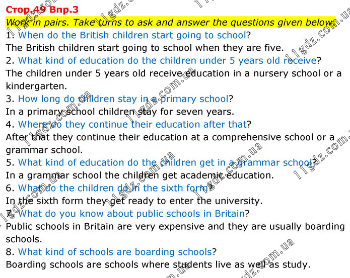 Work in pairs. Take turns to ask and answer the questions given below. 1. When do the British children start going to school? The British children start going to school when they are five. 2. What kind of education do the children under 5 years old receive? The children under 5 years old receive education in a nursery school or a kindergarten. 3. How long do children stay in a primary school? In a primary school children stay for seven years. 4. Where do they continue their education after that? After that they continue their education at a comprehensive school or a grammar school. 5. What kind of education do the children get in a grammar school? In a grammar school the children get academic education. 6. What do the children do in the sixth form? In the sixth form they get ready to enter the university. 7. What do you know about public schools in Britain? Public schools in Britain are very expensive and they are usually boarding schools. 8. What kind of schools are boarding schools? Boarding schools are schools where students live as well as study.