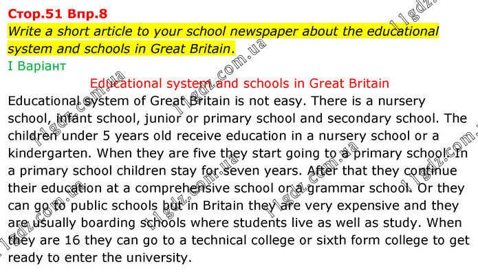 Write a short article to your school newspaper about the educational system and schools in Great Britain. І Варіант Educational system and schools in Great Britain Educational system of Great Britain is not easy. There is a nursery school, infant school, junior or primary school and secondary school. The children under 5 years old receive education in a nursery school or a kindergarten. When they are five they start going to a primary school. In a primary school children stay for seven years. After that they continue their education at a comprehensive school or a grammar school. Or they can go to public schools but in Britain they are very expensive and they are usually boarding schools where students live as well as study. When they are 16 they can go to a technical college or sixth form college to get ready to enter the university.