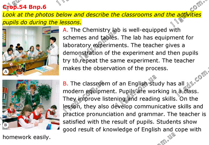 Look at the photos below and describe the classrooms and the activities pupils do during the lessons. A. The Chemistry lab is well-equipped with schemes and tables. The lab has equipment for laboratory experiments. The teacher gives a demonstration of the experiment and then pupils try to repeat the same experiment. The teacher makes the observation of the process. B. The classroom of an English study has all modern equipment. Pupils are working in a class. They improve listening and reading skills. On the lesson, they also develop communicative skills and practice pronunciation and grammar. The teacher is satisfied with the result of pupils. Students show good result of knowledge of English and cope with homework easily.