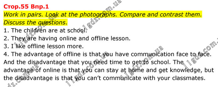 Work in pairs. Look at the photographs. Compare and contrast them. Discuss the questions. 1. The children are at school. 2. They are having online and offline lesson. 3. I like offline lesson more. 4. The advantage of offline is that you have communication face to face. And the disadvantage that you need time to get to school. The advantage of online is that you can stay at home and get knowledge, but the disadvantage is that you can’t communicate with your classmates.