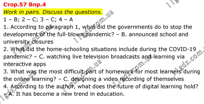 Work in pairs. Discuss the questions. 1 – B; 2 – C; 3 – C; 4 – A 1. According to paragraph 1, what did the governments do to stop the development of the full-blown pandemic? – B. announced school and university closures 2. What did the home-schooling situations include during the COVID-19 pandemic? – C. watching live television broadcasts and learning via interactive apps 3. What was the most difficult part of homework for most learners during the online learning? – C. designing a video recording of themselves 4. According to the author, what does the future of digital learning hold? – A. It has become a new trend in education.