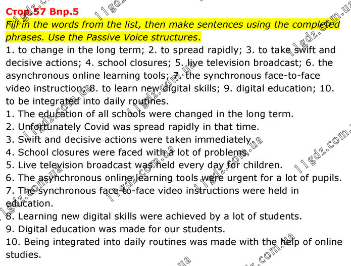 Fill in the words from the list, then make sentences using the completed phrases. Use the Passive Voice structures. 1. to change in the long term; 2. to spread rapidly; 3. to take swift and decisive actions; 4. school closures; 5. live television broadcast; 6. the asynchronous online learning tools; 7. the synchronous face-to-face video instruction; 8. to learn new digital skills; 9. digital education; 10. to be integrated into daily routines. 1. The education of all schools were changed in the long term. 2. Unfortunately Covid was spread rapidly in that time. 3. Swift and decisive actions were taken immediately. 4. School closures were faced with a lot of problems. 5. Live television broadcast was held every day for children. 6. The asynchronous online learning tools were urgent for a lot of pupils. 7. The synchronous face-to-face video instructions were held in education. 8. Learning new digital skills were achieved by a lot of students. 9. Digital education was made for our students. 10. Being integrated into daily routines was made with the help of online studies.