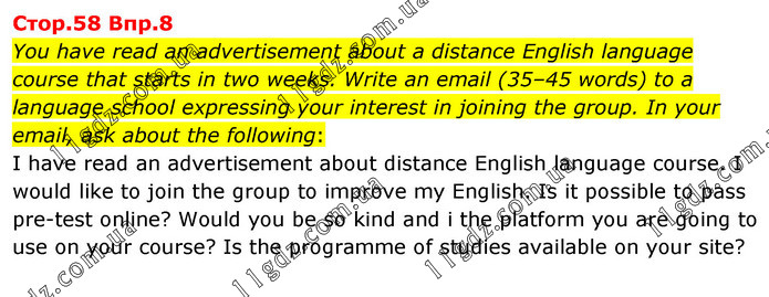 You have read an advertisement about a distance English language course that starts in two weeks. Write an email (35–45 words) to a language school expressing your interest in joining the group. In your email, ask about the following: I have read an advertisement about distance English language course. I would like to join the group to improve my English. Is it possible to pass pre-test online? Would you be so kind and i the platform you are going to use on your course? Is the programme of studies available on your site?