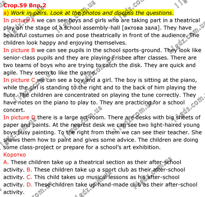 а) Work in pairs. Look at the photos and discuss the questions. In picture A we can see boys and girls who are taking part in a theatrical play on the stage of a school assembly-hall [актова зала]. They have beautiful costumes on and pose theatrically in front of the audience. The children look happy and enjoying themselves. In picture В we can see pupils in the school sports-ground. They look like senior-class pupils and they are playing Frisbee after classes. There are two teams of boys who are trying to catch the disk. They are quick and agile. They seem to like the game. In picture С we can see a boy and a girl. The boy is sitting at the piano, while the girl is standing to the right and to the back of him playing the flute. The children are concentrated on playing the tune correctly. They have notes on the piano to play to. They are practicing for a school concert. In picture D there is a large art-room. There are desks with big sheets of paper and paints. At the nearest desk we can see two light-haired young boys busy painting. To the right from them we can see their teacher. She shows them how to paint and gives some advice. The children are doing some class-project or prepare for a school’s art exhibition. Коротко A. These children take up a theatrical section as their after-school activity. B. These children take up a sport club as their after-school activity. C. This child takes up musical lessons as his after-school activity. D. These children take up hand-made club as their after-school activity.