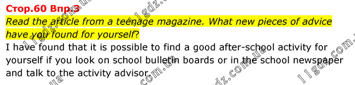 Read the article from a teenage magazine. What new pieces of advice have you found for yourself? I have found that it is possible to find a good after-school activity for yourself if you look on school bulletin boards or in the school newspaper and talk to the activity advisor.