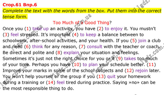 Complete the text with the words from the box. Put them into the correct tense form. Too Much of a Good Thing? Once you (1) take up an activity, you have (2) to enjoy it. You mustn’t (3) feel stressed. It’s important (4) to keep a balance between to schoolwork, after-school activities, and your health. If you (5) join a club and need (6) think for any reason, (7) consult with the teacher or coach. Be direct and polite and (8) explain your situation and feelings. Sometimes it’s just not the right choice for you or it (9) takes too much of your time. Perhaps you have (10) to plan your schedule better. (11) Improve your marks in some of the school subjects and (12) rejoin later. You won’t help yourself or the group if you (13) quit your homework during a training or (14) feel tired during practice. Saying »no» can be the most responsible thing to do.