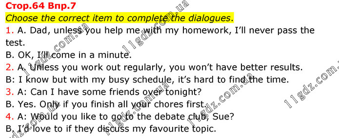 Choose the correct item to complete the dialogues. 1. A. Dad, unless you help me with my homework, I’ll never pass the test. B. OK, I’ll come in a minute. 2. A. Unless you work out regularly, you won’t have better results. B: I know but with my busy schedule, it’s hard to find the time. 3. A: Can I have some friends over tonight? B. Yes. Only if you finish all your chores first. 4. A: Would you like to go to the debate club, Sue? B. I’d love to if they discuss my favourite topic.