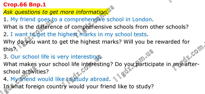 Ask questions to get more information. 1. My friend goes to a comprehensive school in London. What is the difference of comprehensive schools from other schools? 2. I want to get the highest marks in my school tests. Why do you want to get the highest marks? Will you be rewarded for this? 3. Our school life is very interesting. What makes your school life interesting? Do you participate in any after-school activities? 4. My friend would like to study abroad. In what foreign country would your friend like to study?