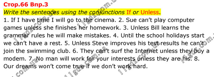 Write the sentences using the conjunctions If or Unless. 1. If I have time I will go to the cinema. 2. Sue can’t play computer games unless she finishes her homework. 3. Unless Bill learns the grammar rules he will make mistakes. 4. Until the school holidays start we can’t have a rest. 5. Unless Steve improves his test results he can’t join the swimming club. 6. They can’t surf the Internet unless they buy a modem. 7. No man will work for your interests unless they are his. 8. Our dreams won’t come true if we don’t work hard.